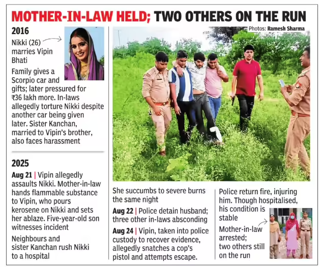 Police said Rohit Bhati, 28, was picked up near Sirsa Toll Chauraha on Monday, two days after the incident. His father, Satveer Bhati, was also taken into custody shortly after. Both men had been on the run since Nikki’s death. With these arrests, all four accused named in the FIR — Nikki’s husband Vipin, his mother Daya, brother Rohit and father Satveer — are now behind bars.
